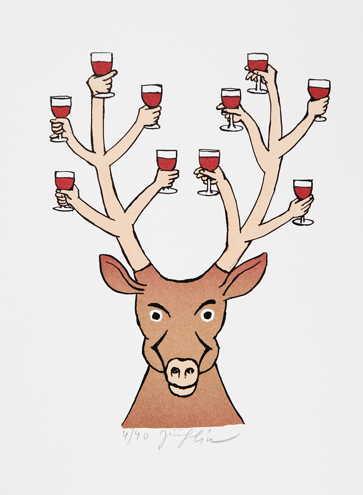 He makes also colour litographs, etchings and oil paintings. His graphic humor is usually built on a paradox - position other serious and common themes in unexpected contrasts.